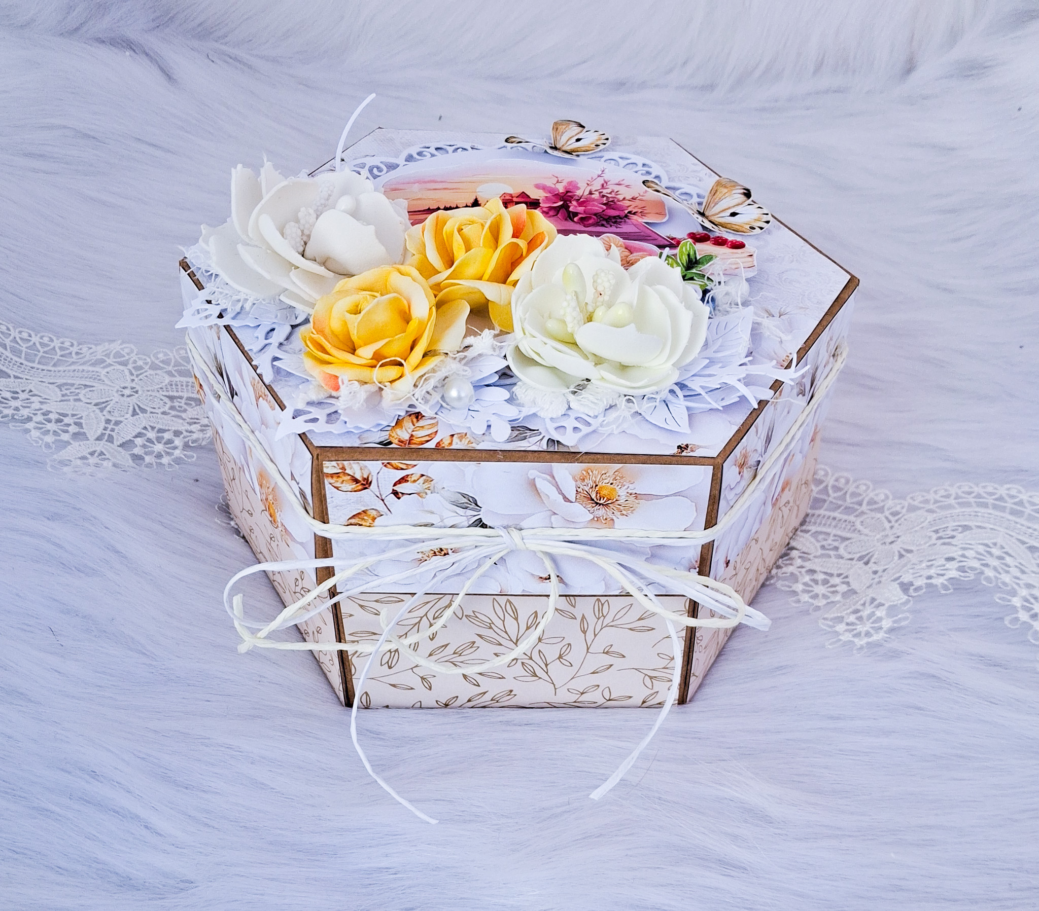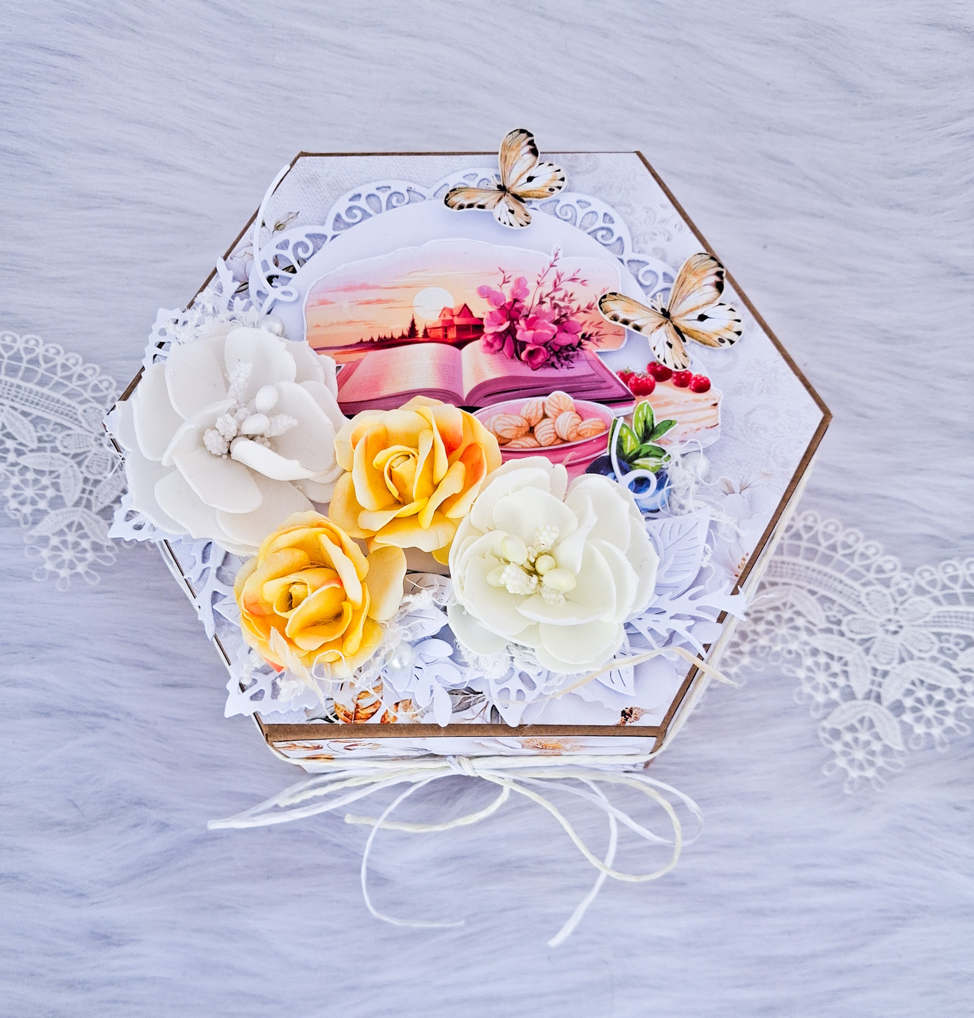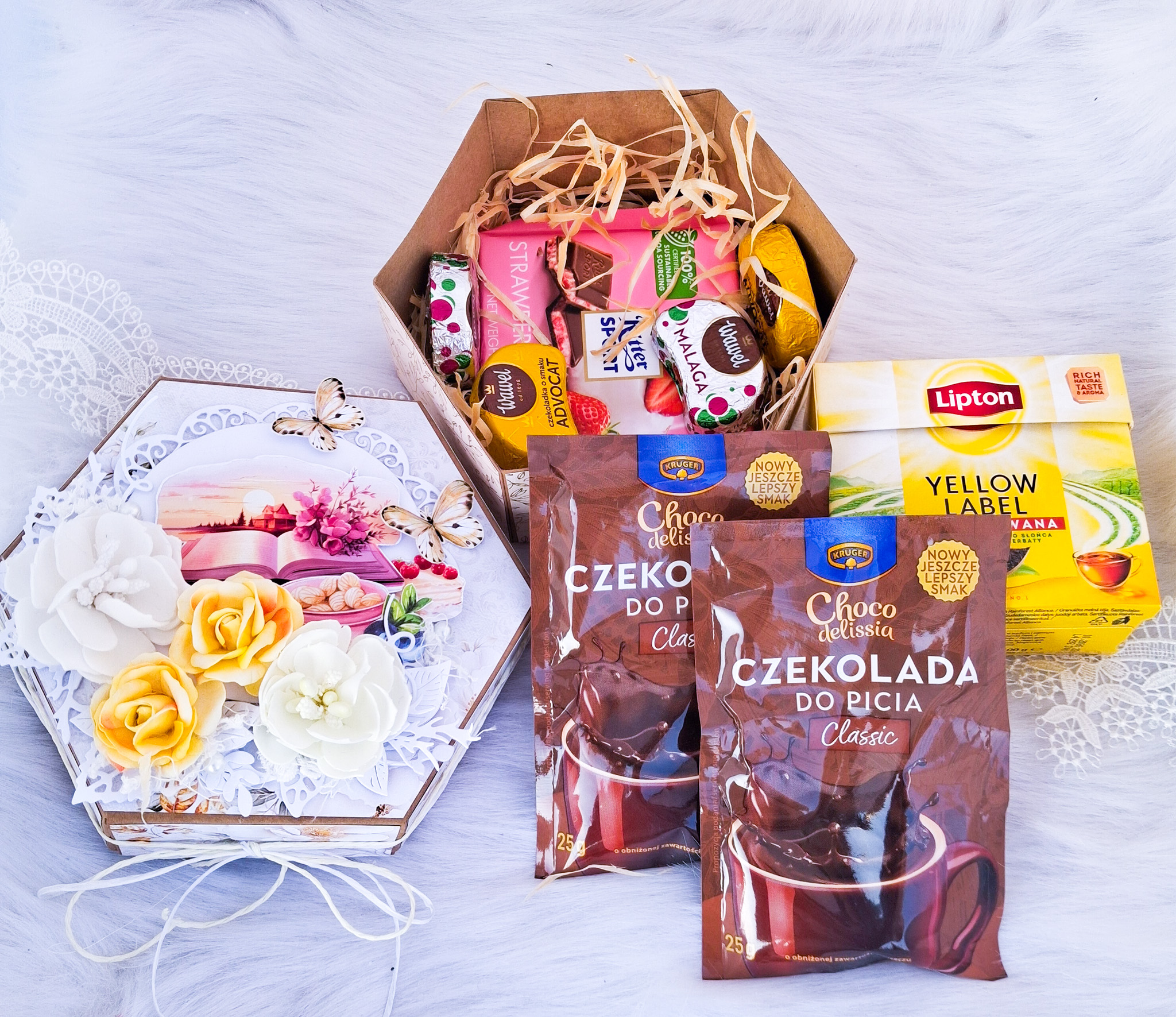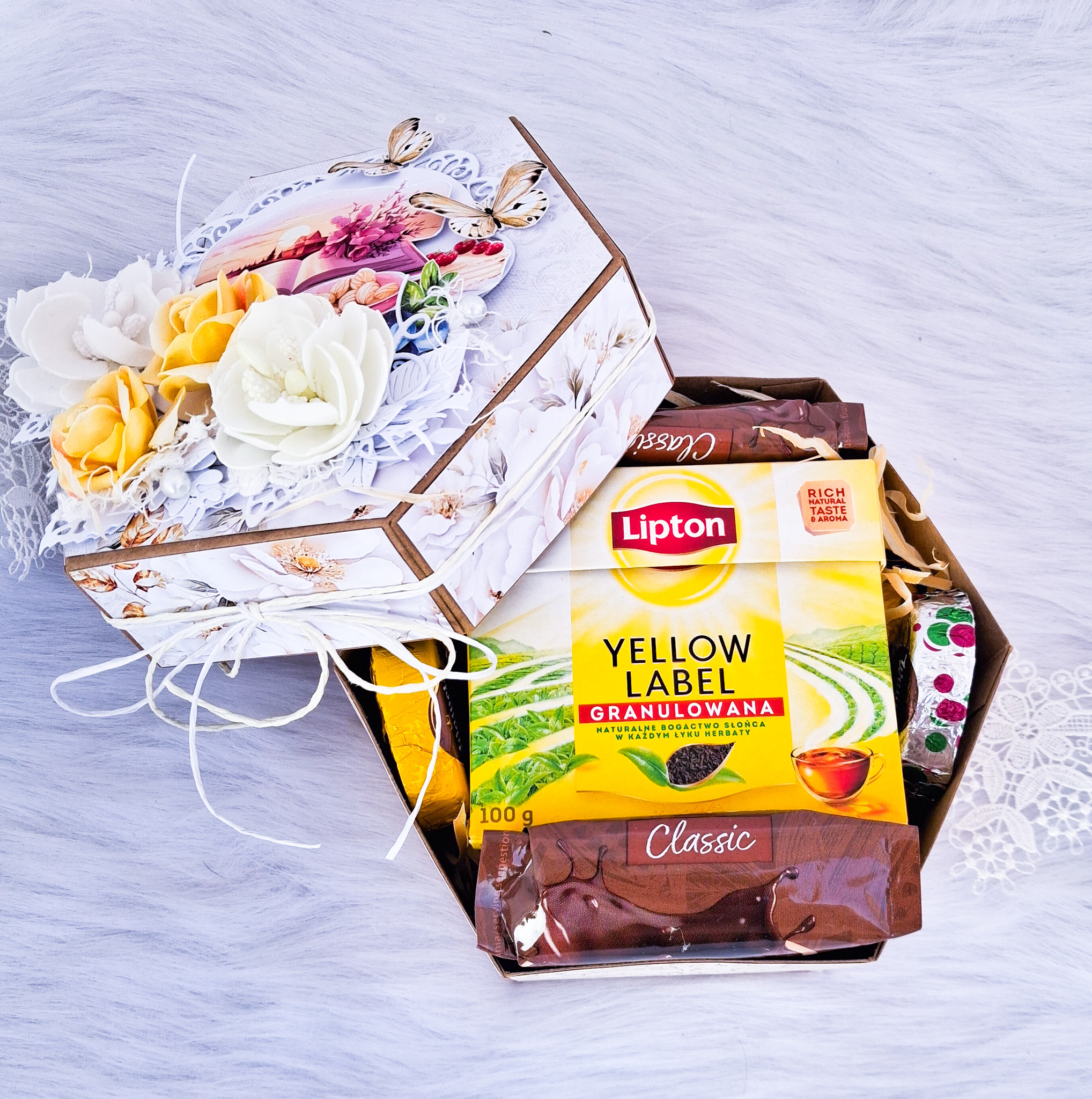 Pudełko jest ręcznie zdobione, dzięki czemu każdy egzemplarz jest niepowtarzalny i pełen uroku. W środku znajduje się starannie dobrany zestaw słodkości, idealnych na chwilę relaksu przy filiżance herbaty.