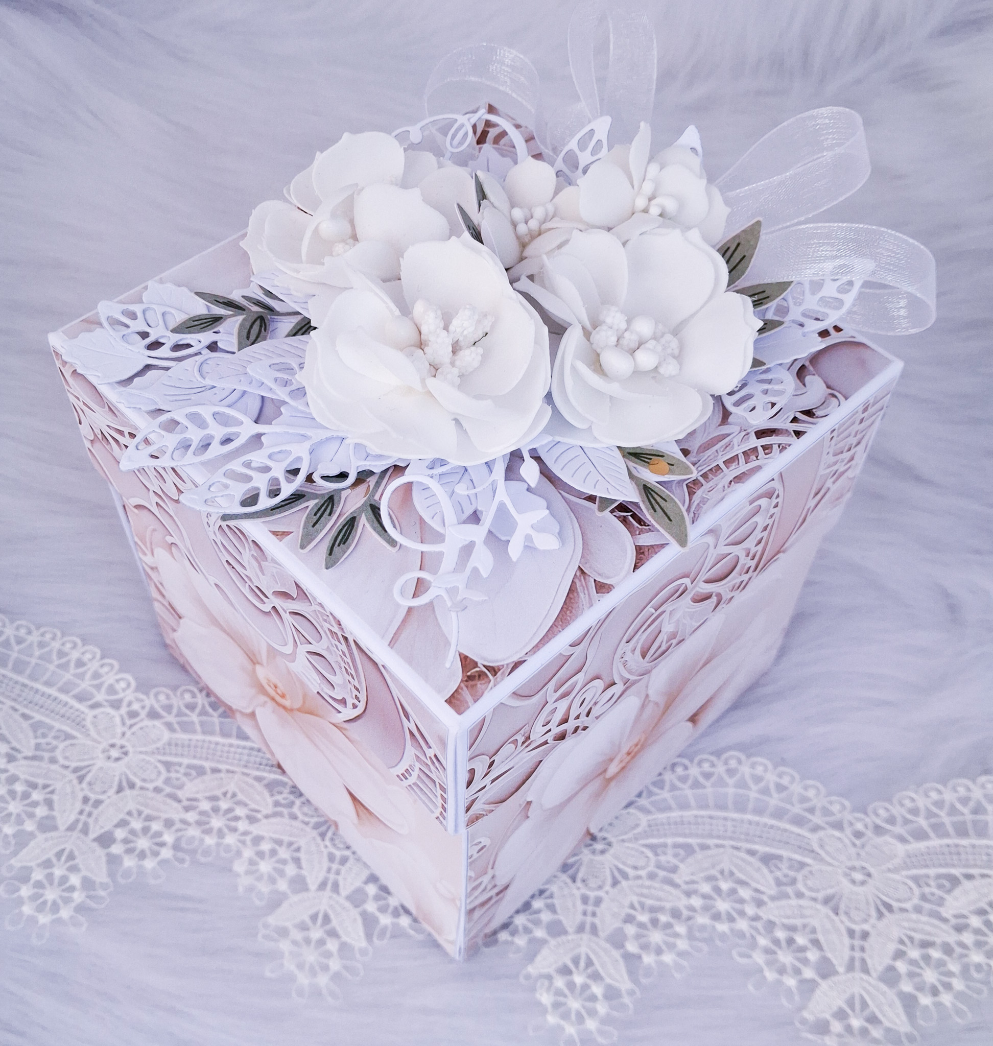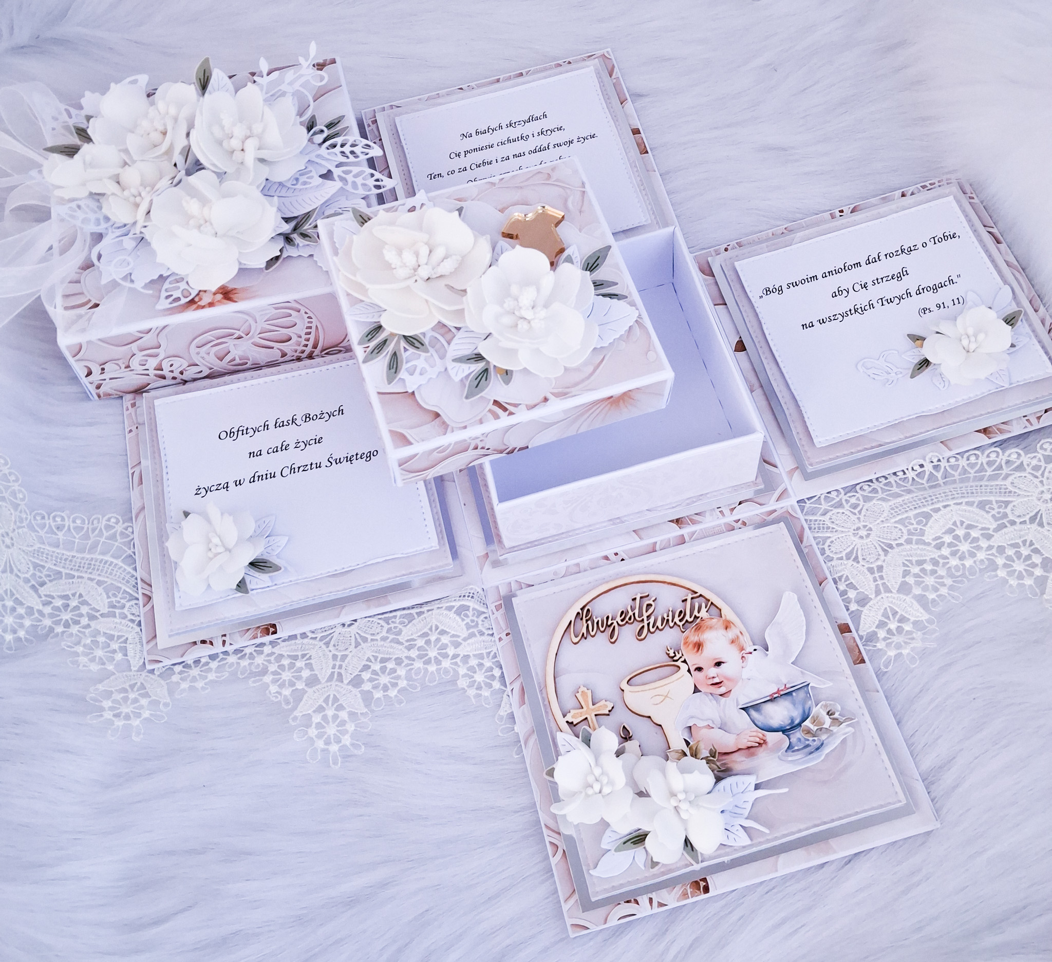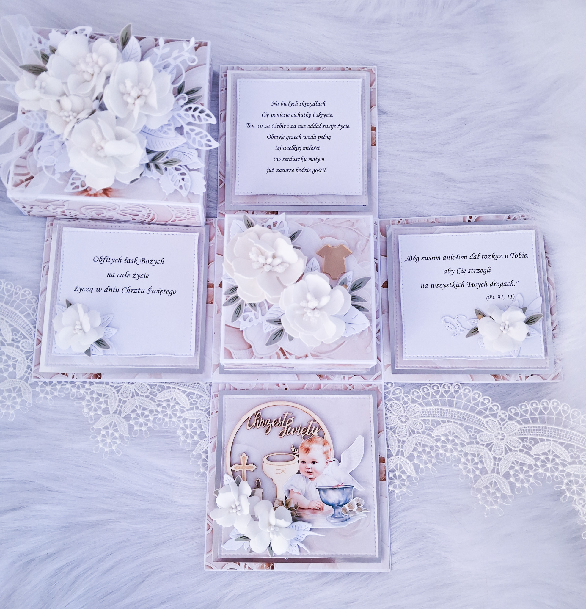 Exploding box po otwarci rozkłada się na cztery strony, gdzie znajdują się życzenia dla dziecka imię i data chrztu oraz dekoracje.