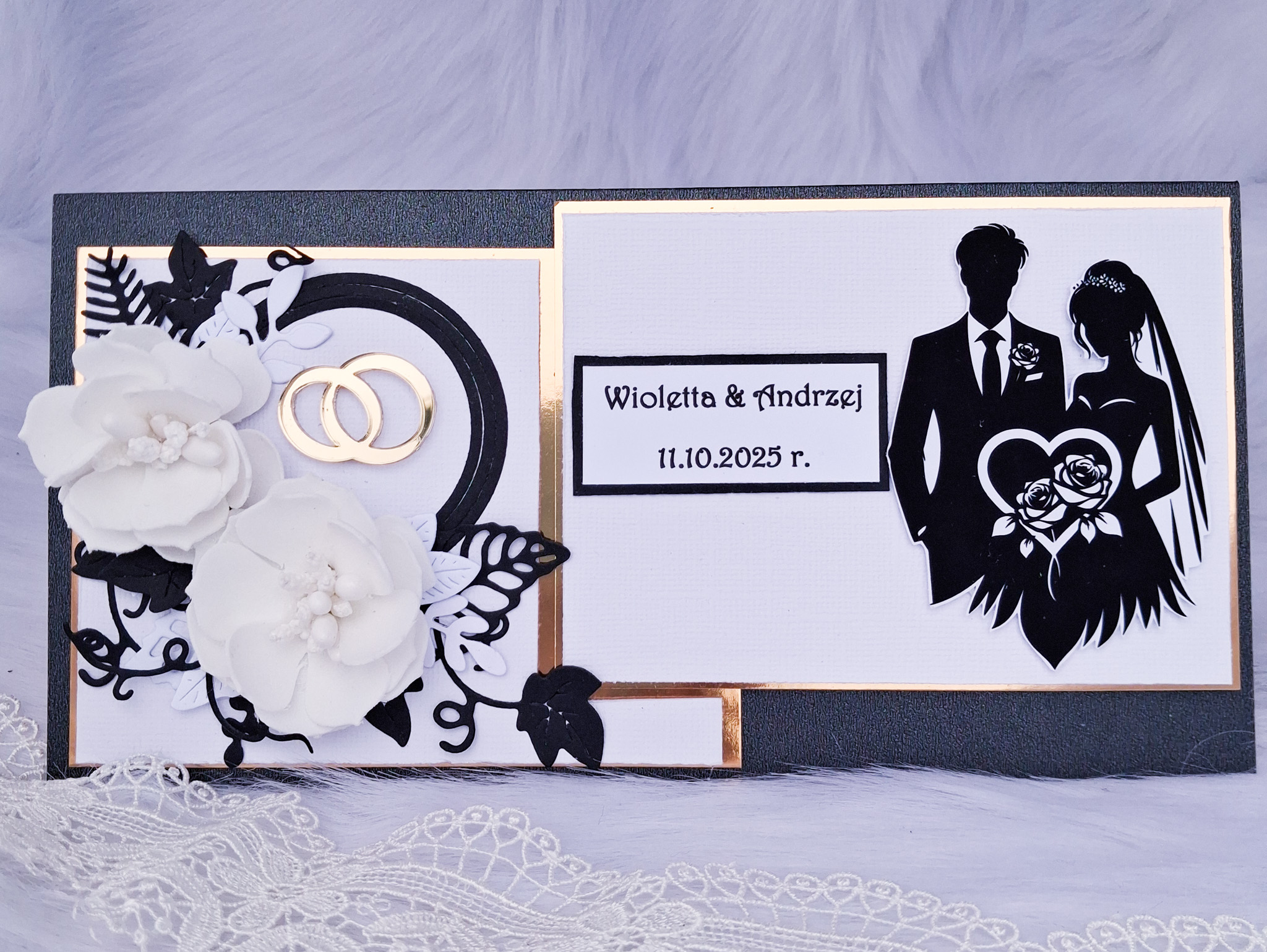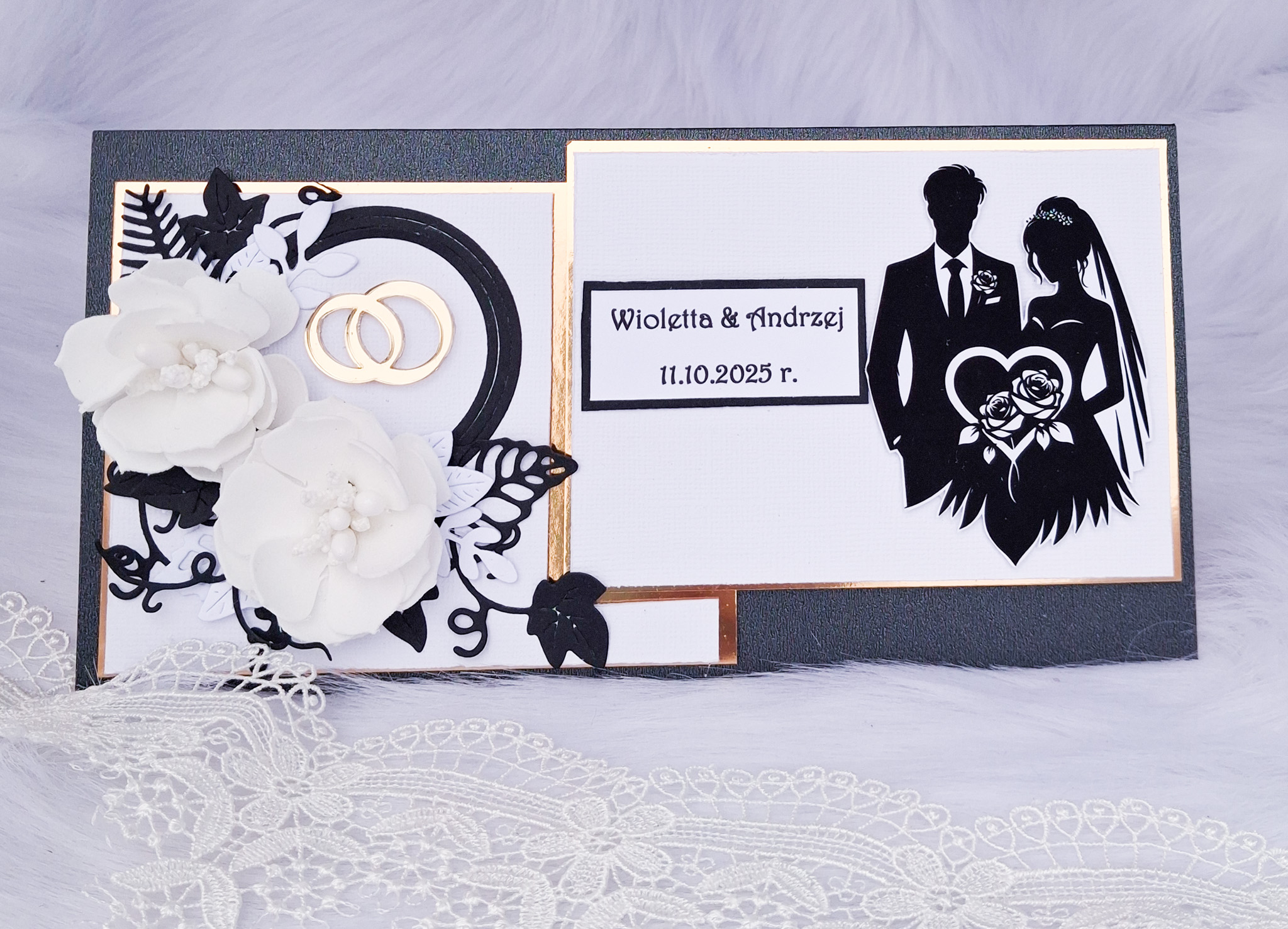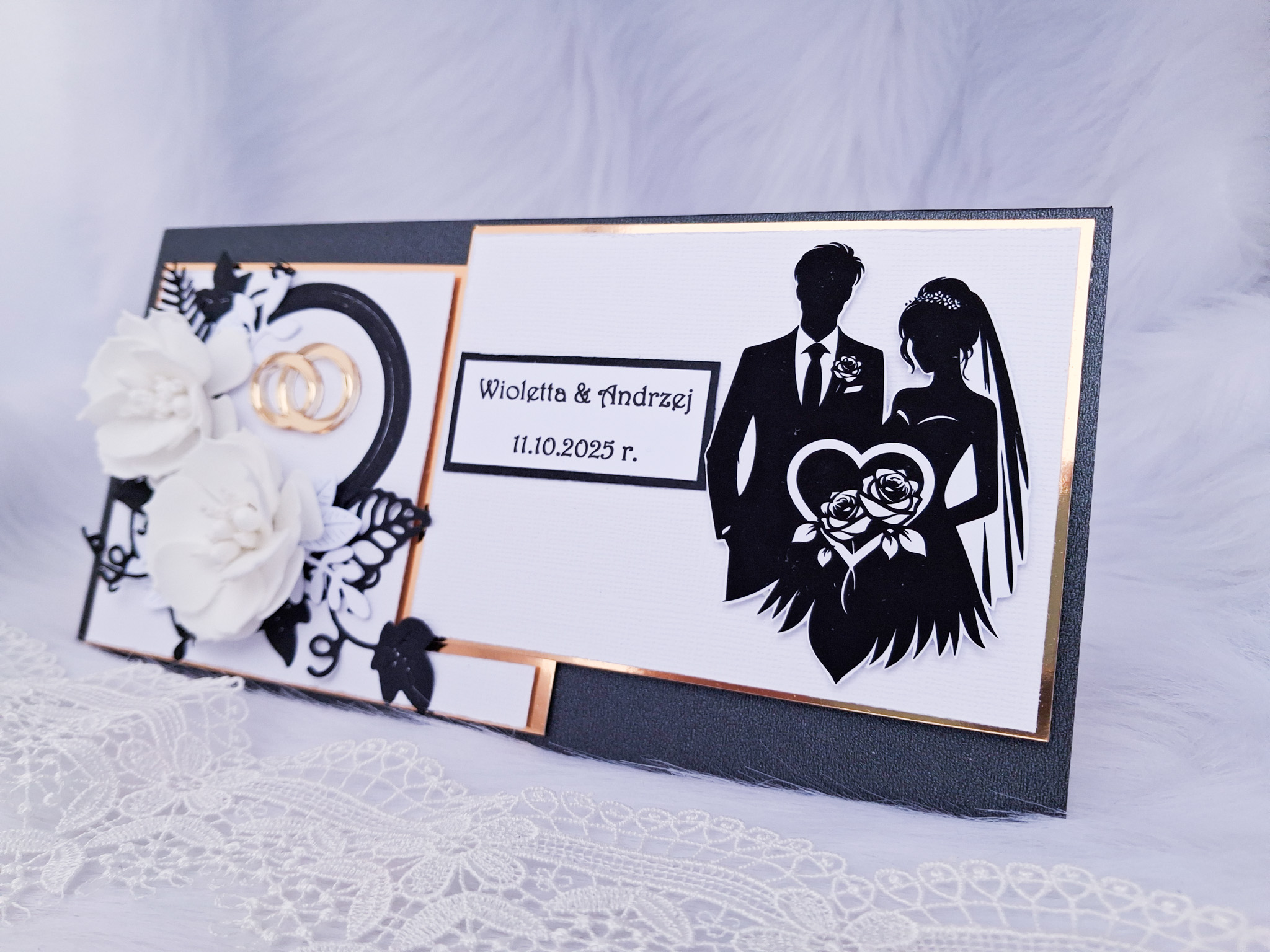 Elegancka kartka ślubna w kolorystyce czarno - białej, będzie wspaniałą pamiątką dla Młodej Pary w tak wyjątkowym dniu.