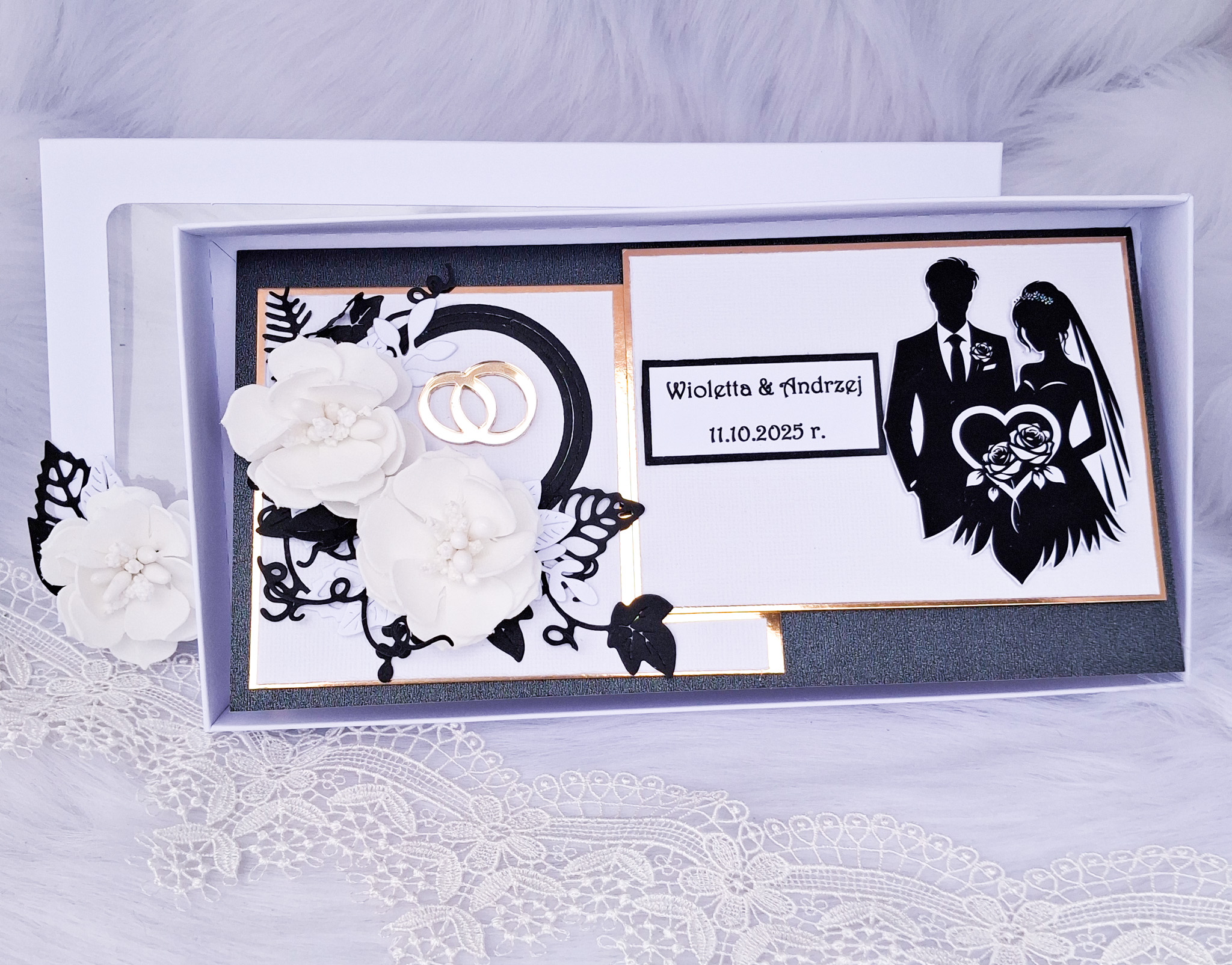 Pamiątka Ślubna kartka ręcznie robiona Czarno-Złota w pudełku
