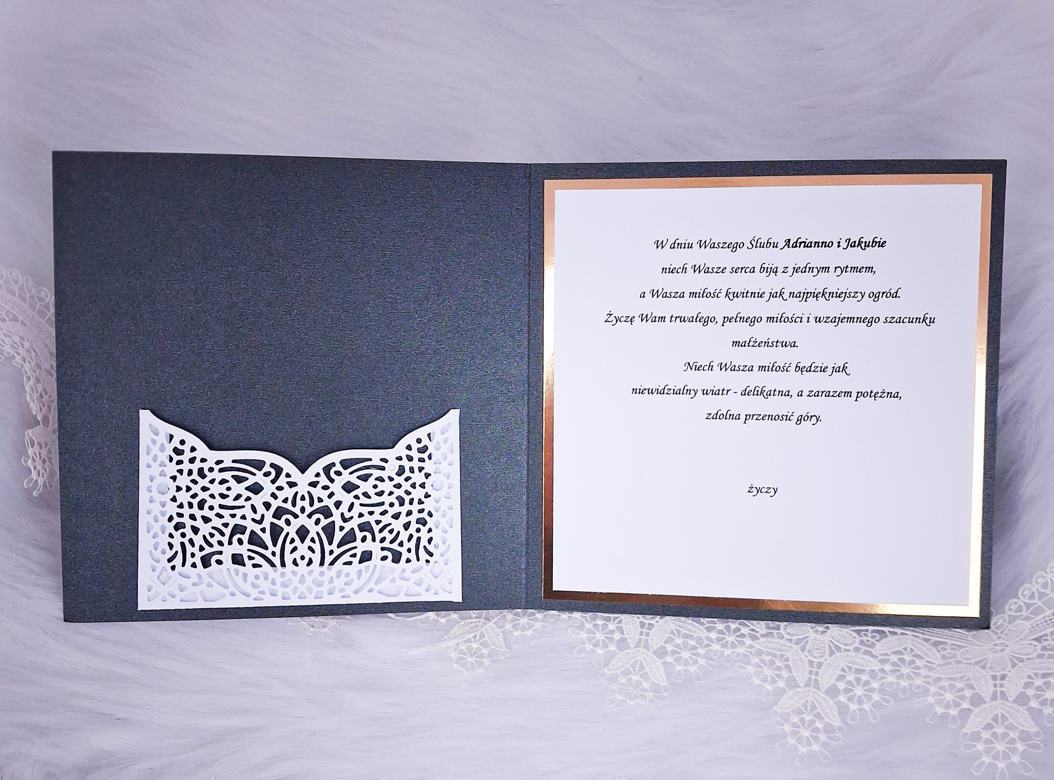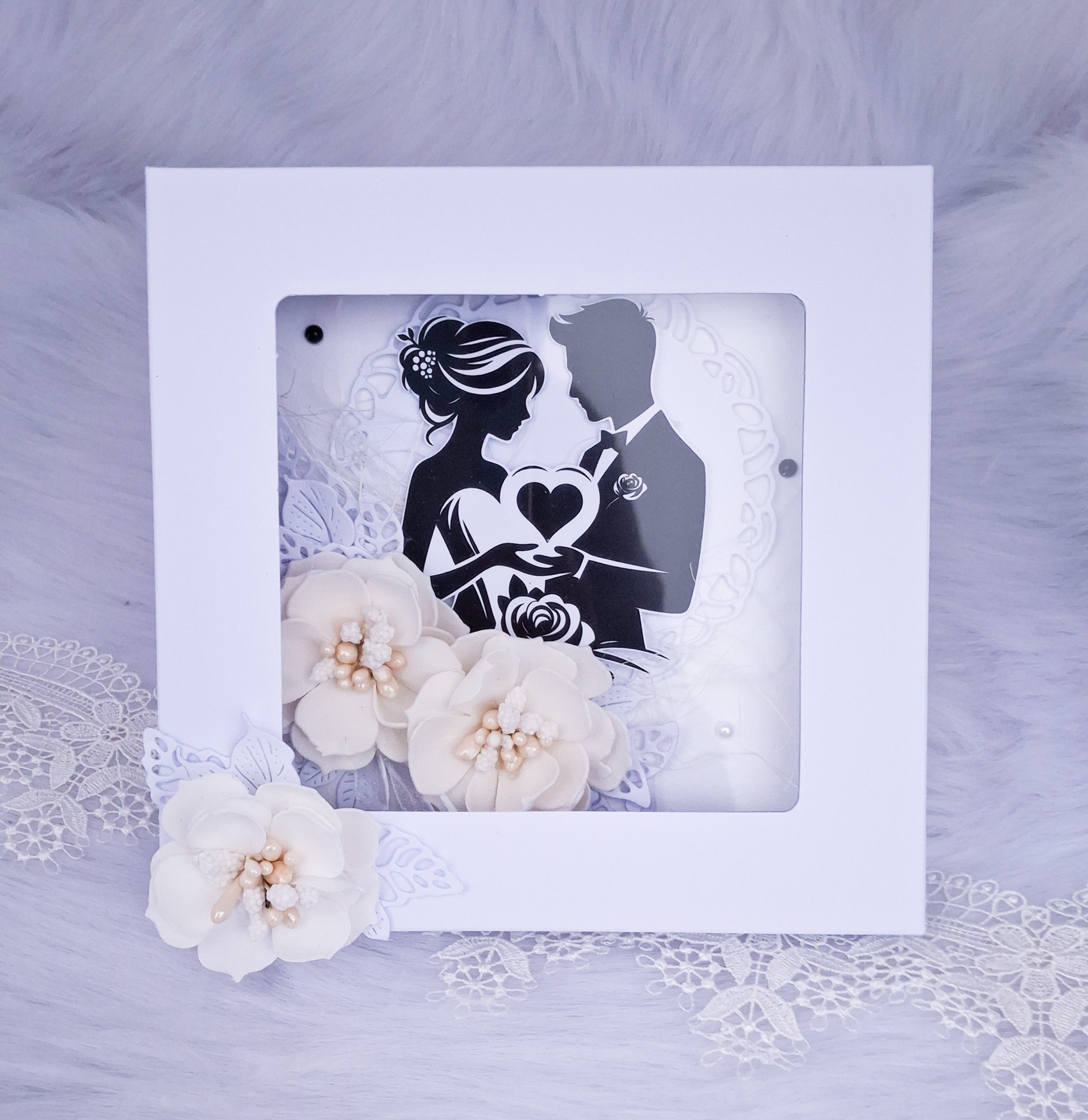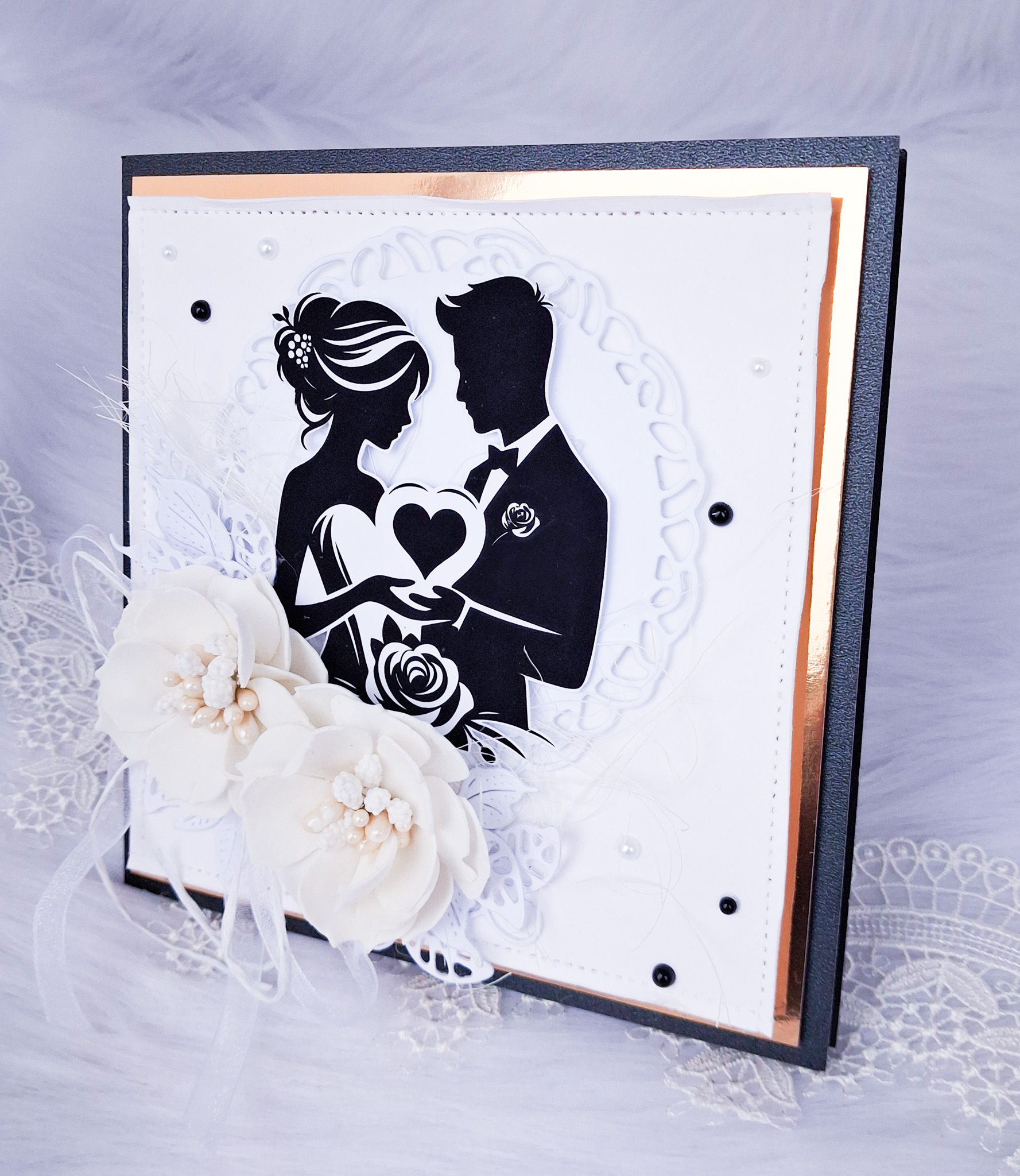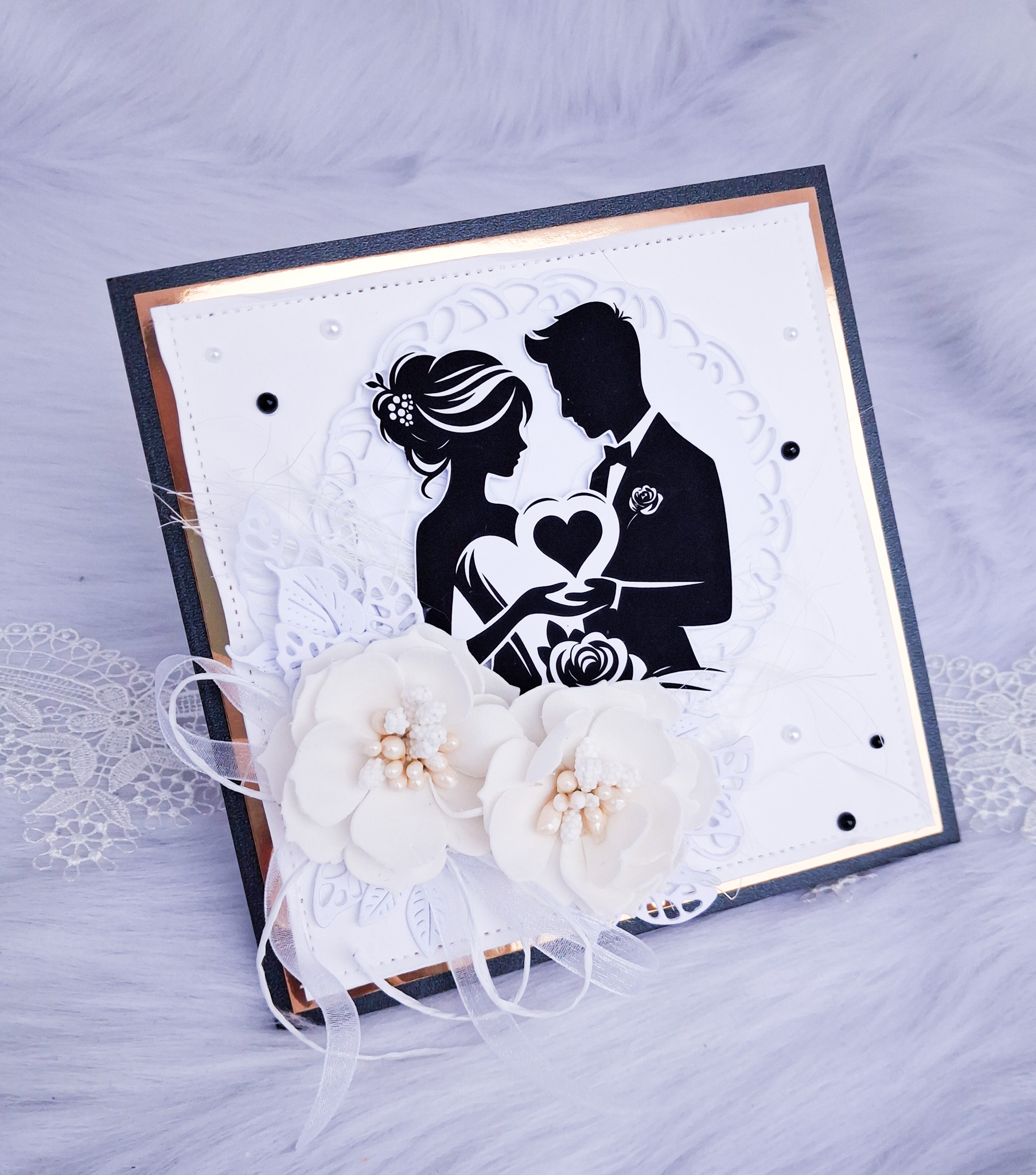 Elegancka kartka ślubna w kolorystyce czarno - białej, będzie wspaniałą pamiątką dla Młodej Pary w tak wyjątkowym dniu.