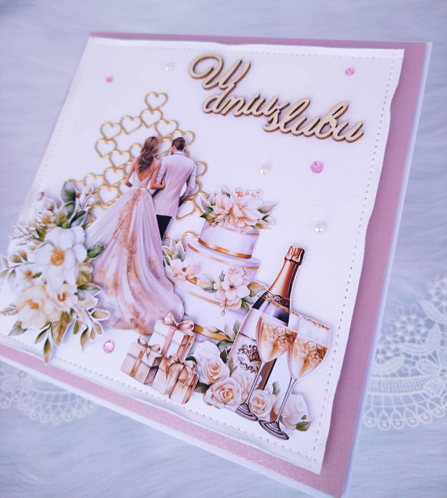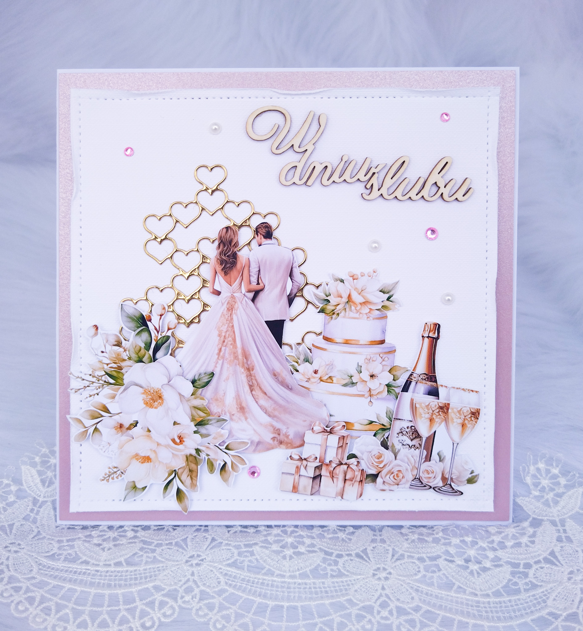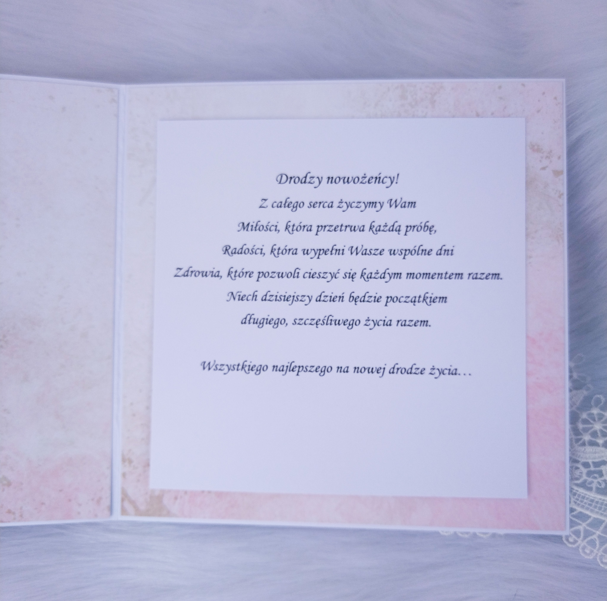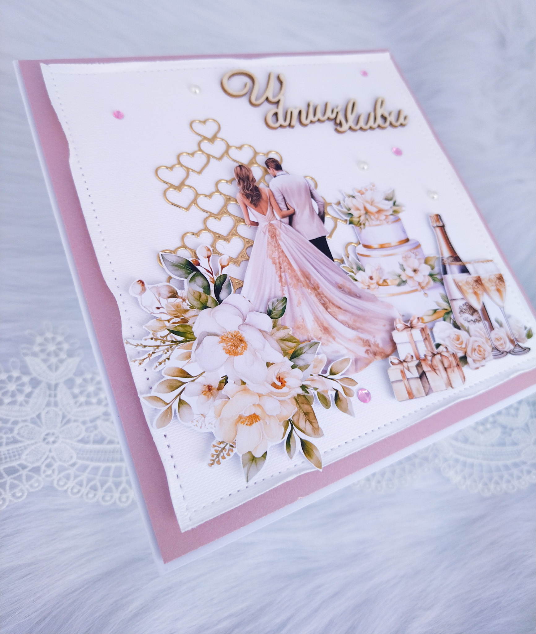 Podaruj wyjątkową pamiątkę, która na zawsze pozostanie w sercach nowożeńców! Elegancka kartka ślubna w delikatnej kolorystyce różowo-złotej, będzie wspaniałą pamiątką dla Młodej Pary w tak wyjątkowym dniu.