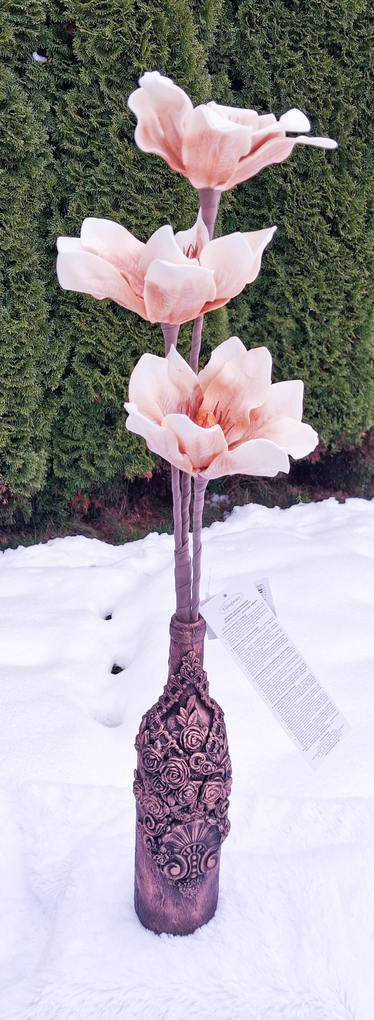 W zestawie znajduje się piankowy kwiat, który idealnie komponuje się z butelką, tworząc gotową dekorację do każdego wnętrza. To także świetny pomysł na prezent dla osób ceniących rękodzieło i unikalne dodatki.