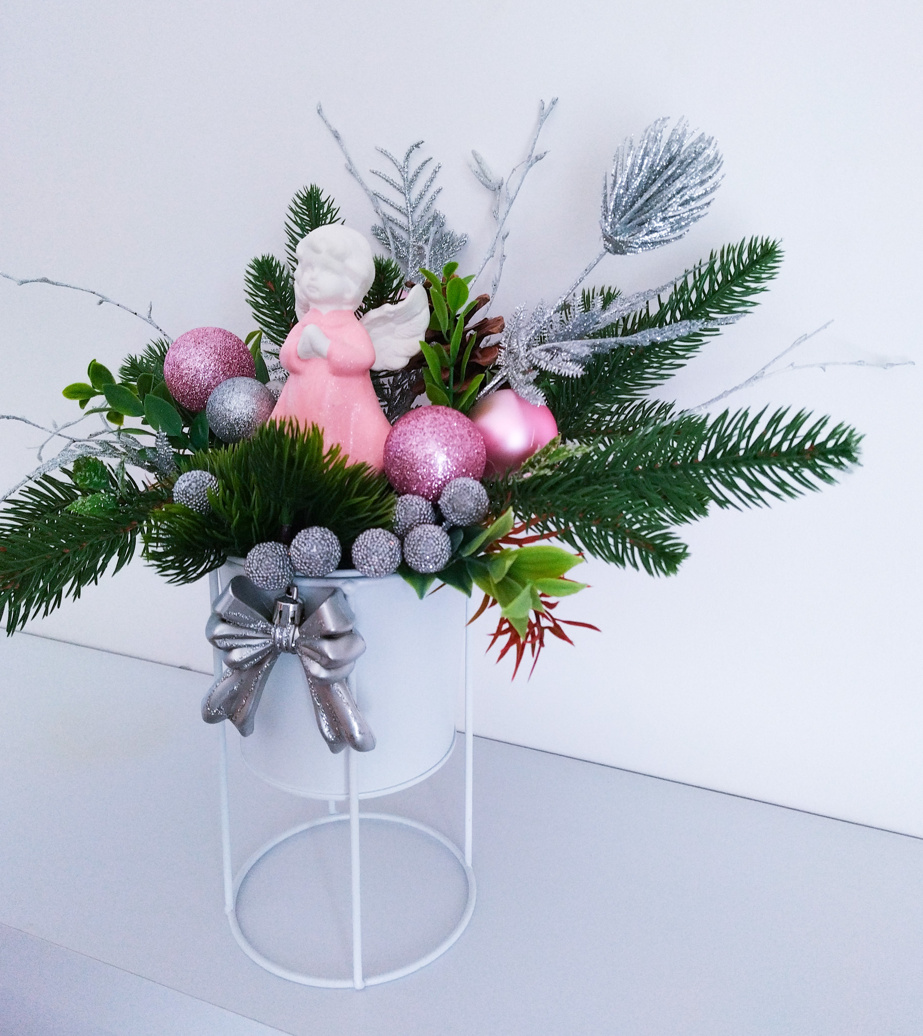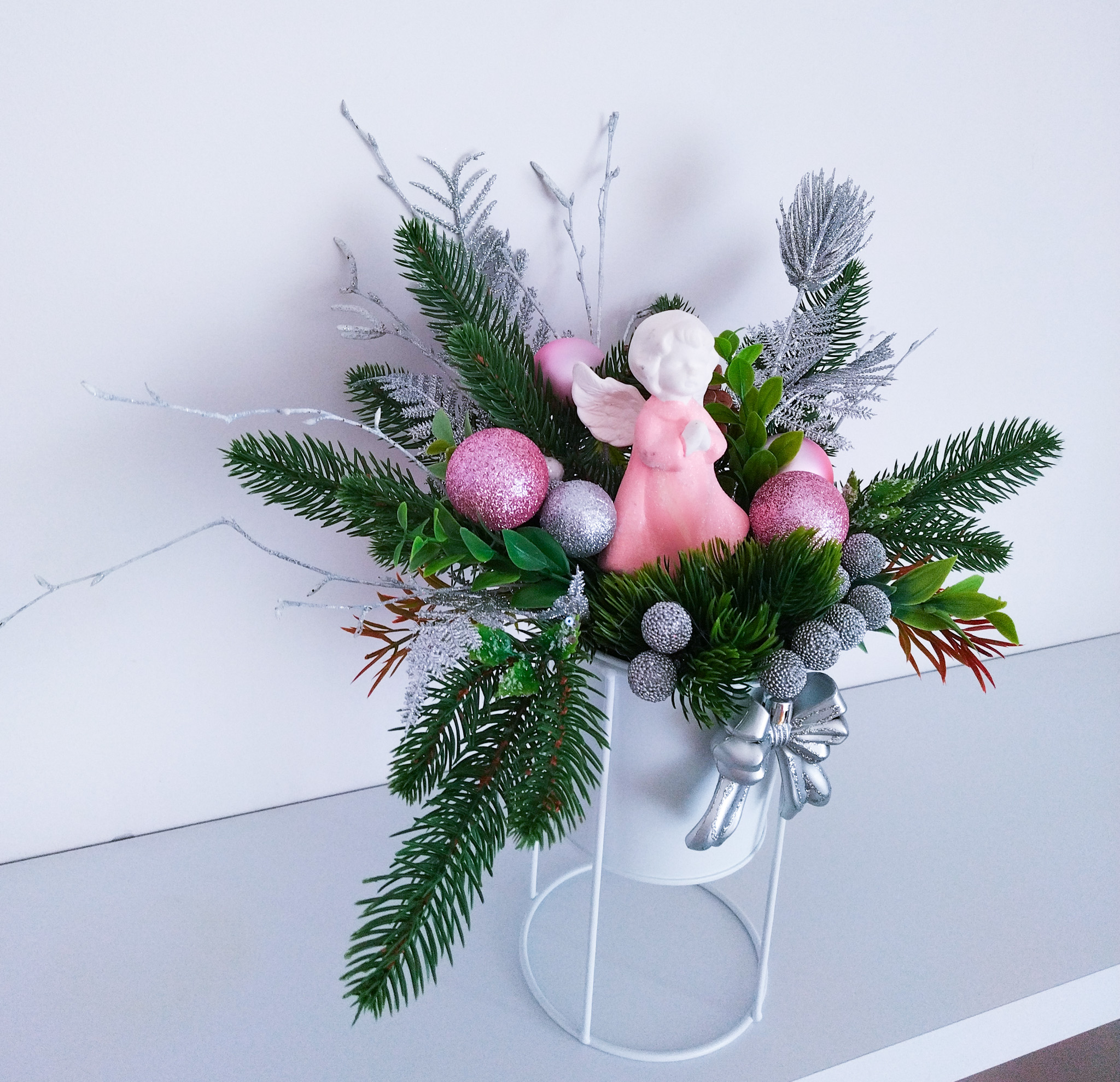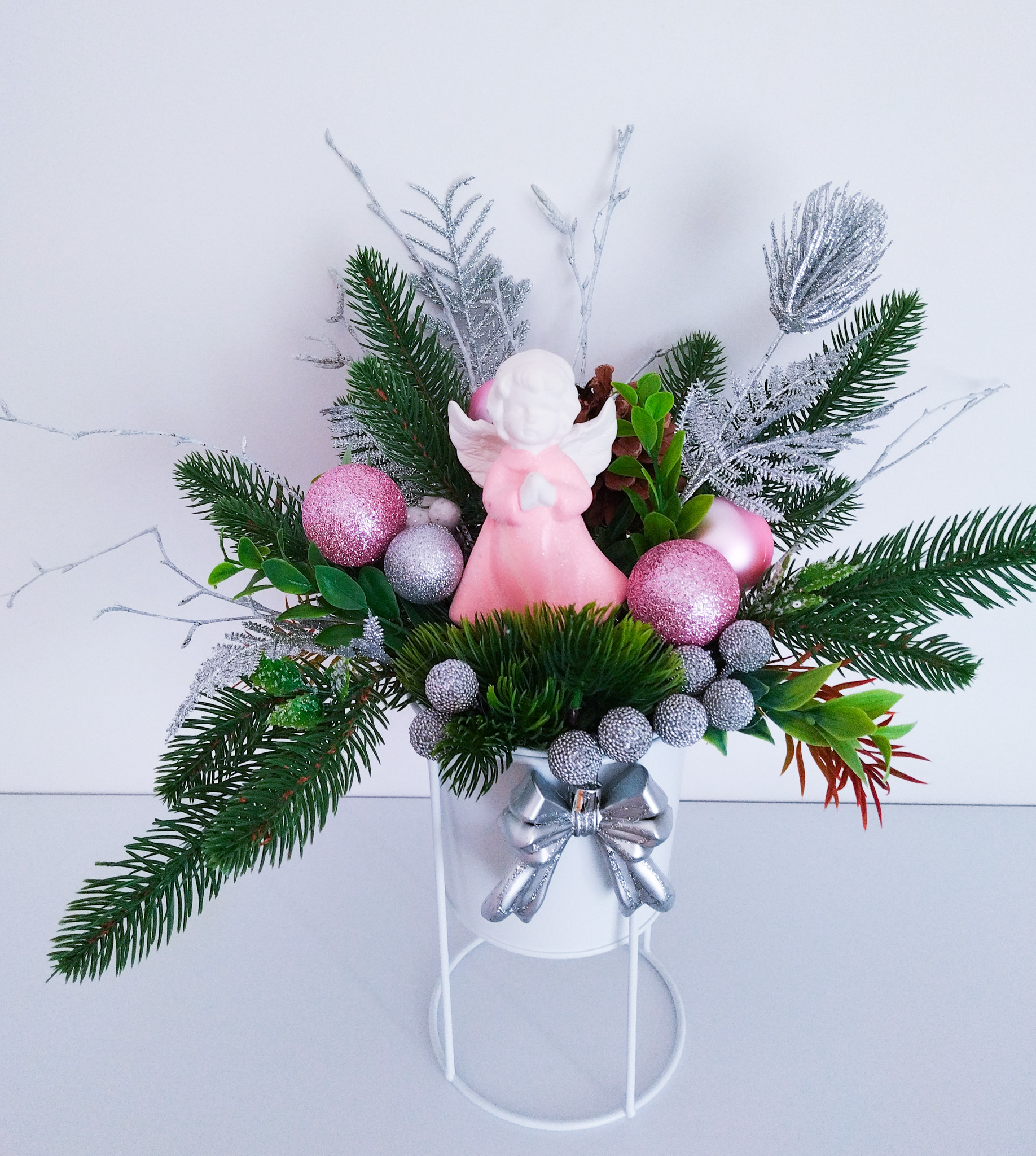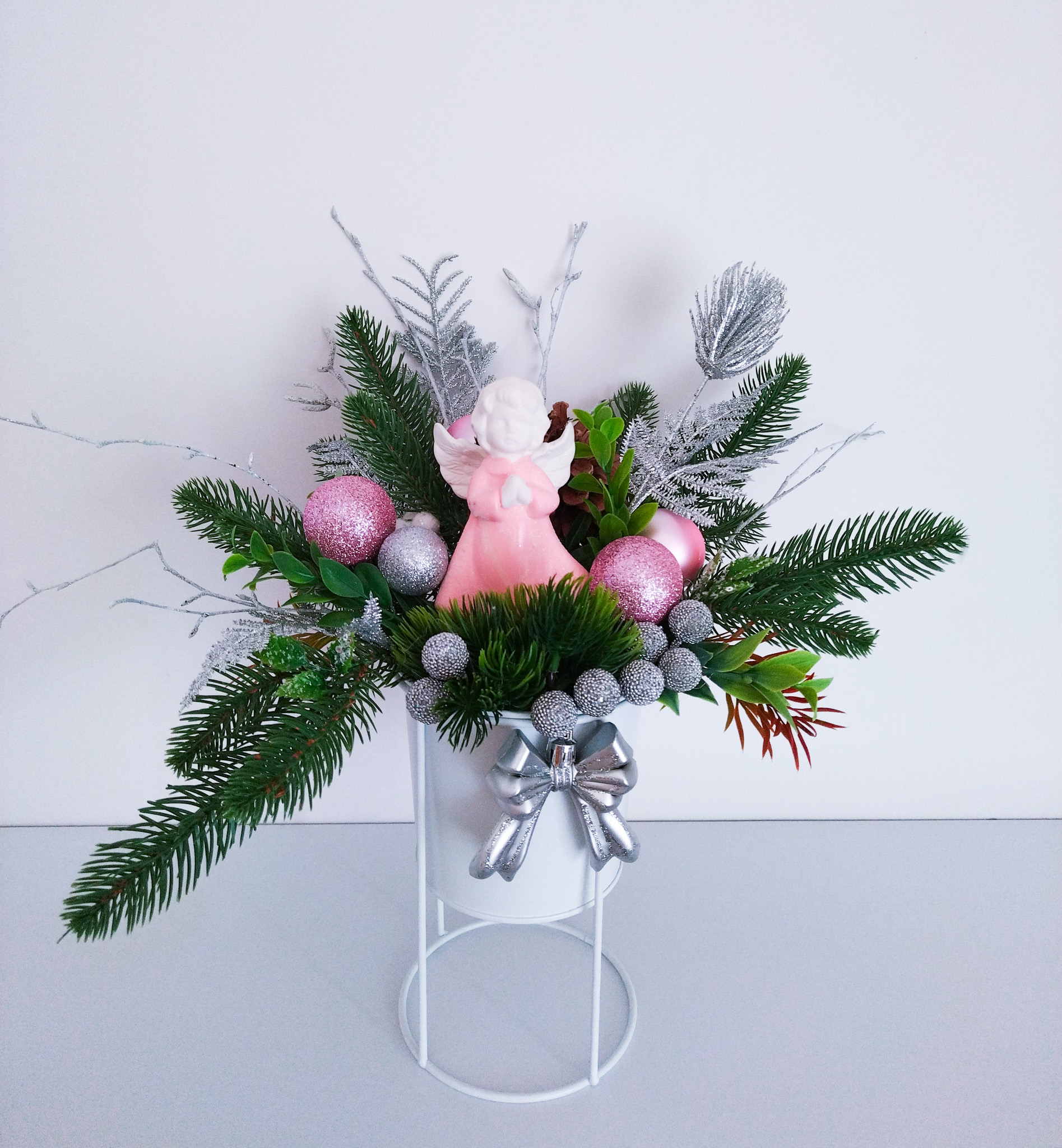 Stroik wykonany jest z wysokiej jakości materiałów, co gwarantuje trwałość i możliwość wielokrotnego wykorzystania w kolejnych sezonach. Centralnym elementem jest różowy aniołek.