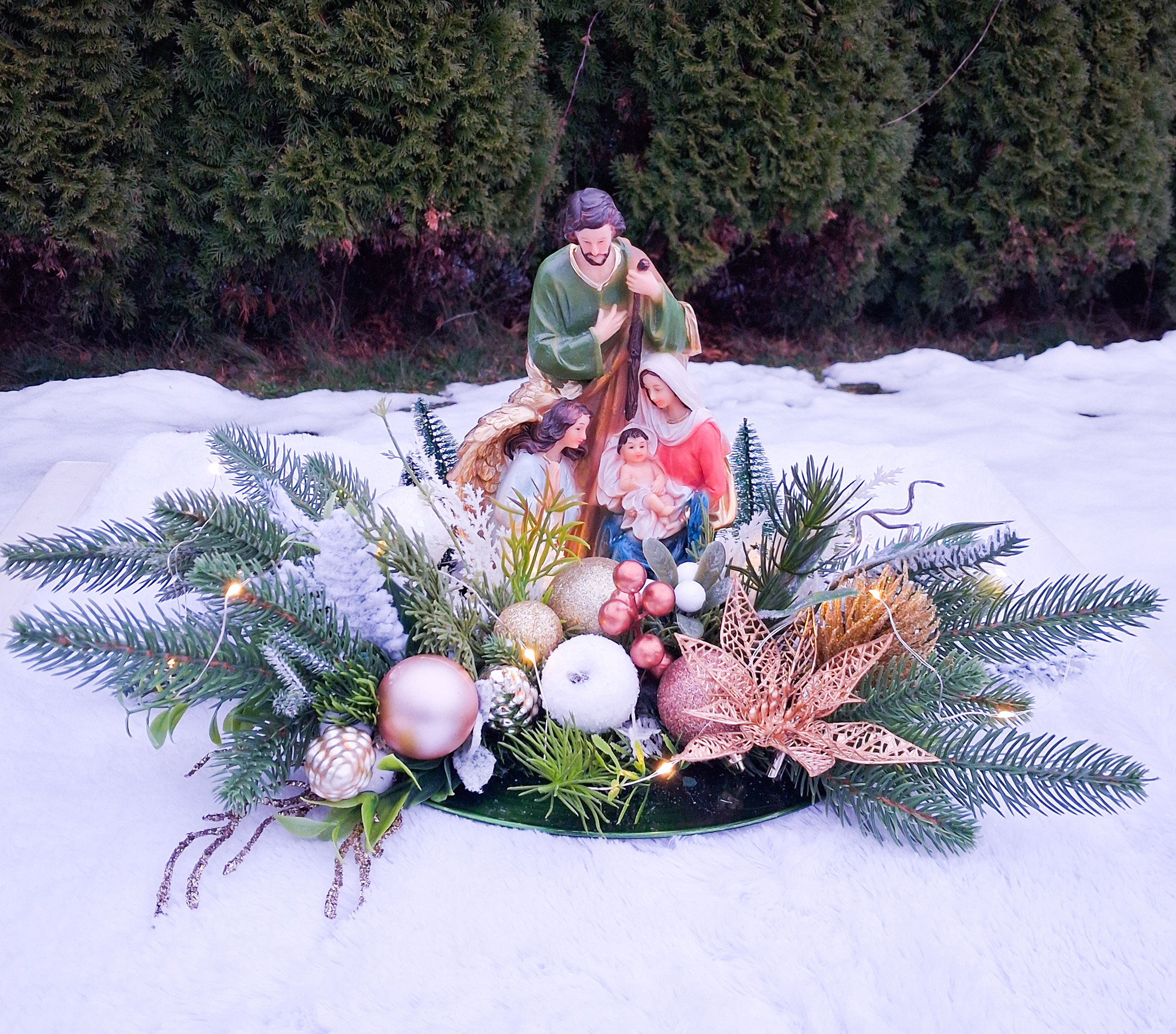 Stroik wykonany jest z wysokiej jakości materiałów, co gwarantuje trwałość i możliwość wielokrotnego wykorzystania w kolejnych sezonach. Centralnym elementem jest piękna figura Świętej Rodziny, otoczona subtelnymi dodatkami w złotych tonacjach: gałązkami, szyszkami.