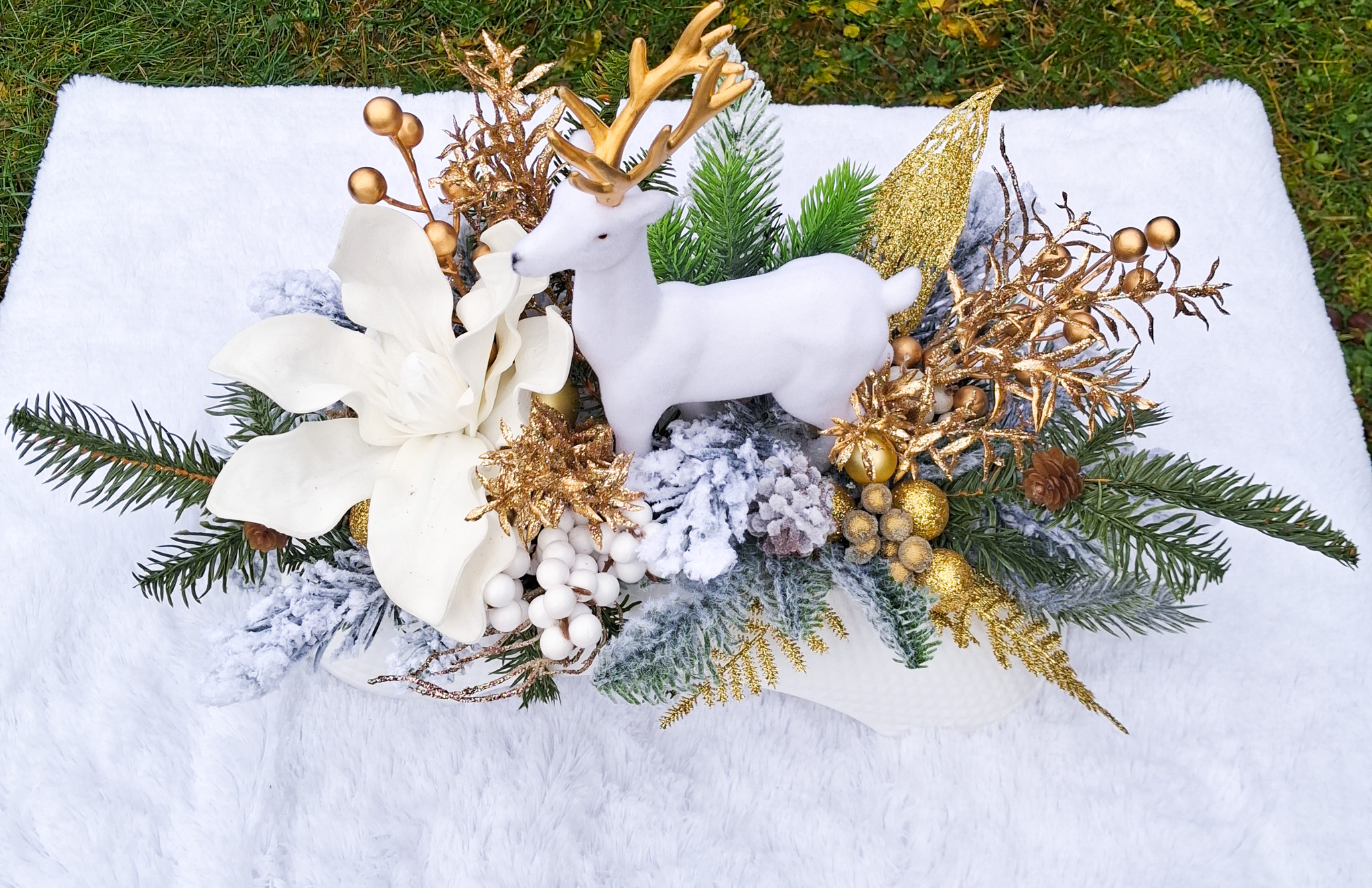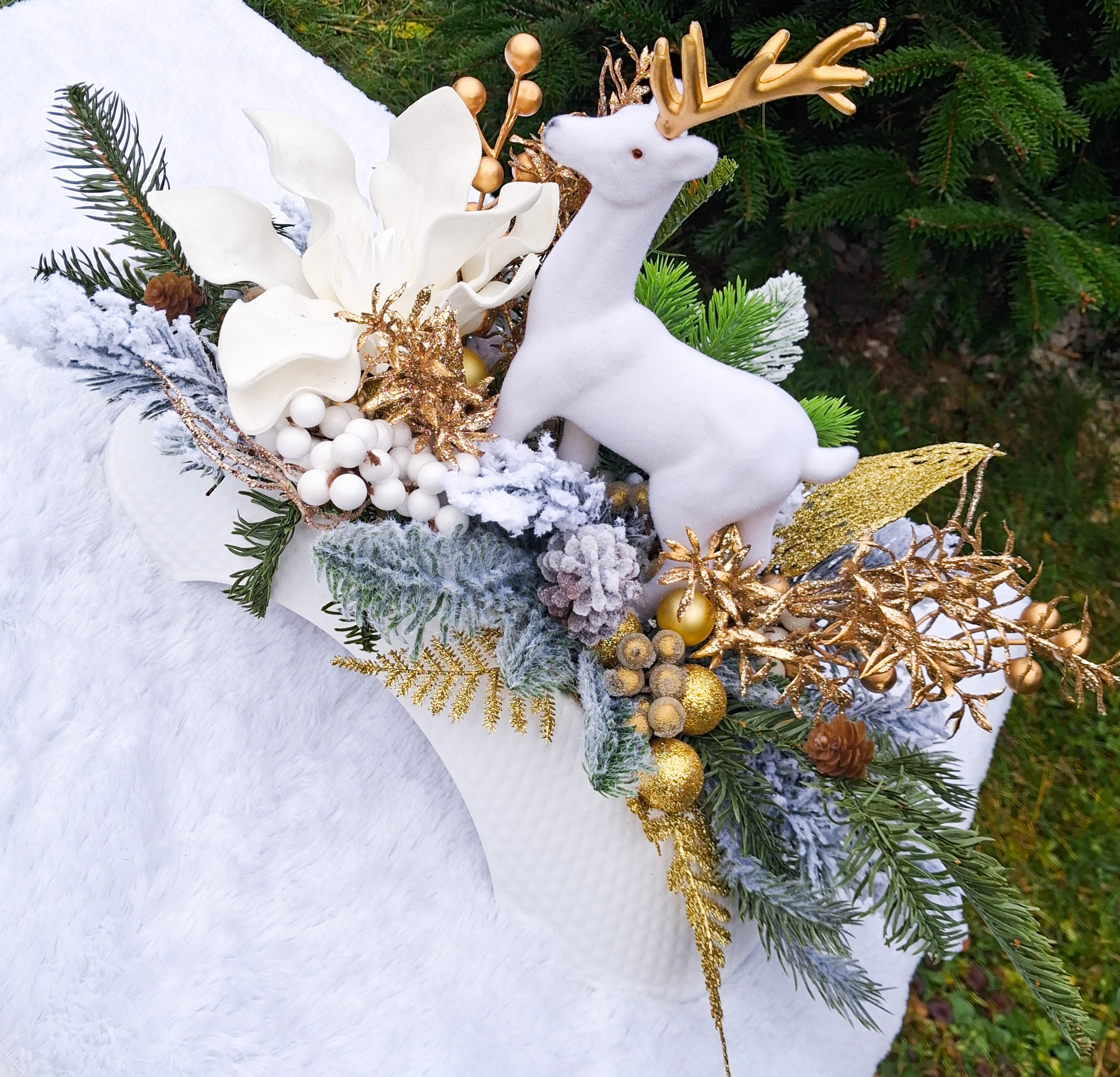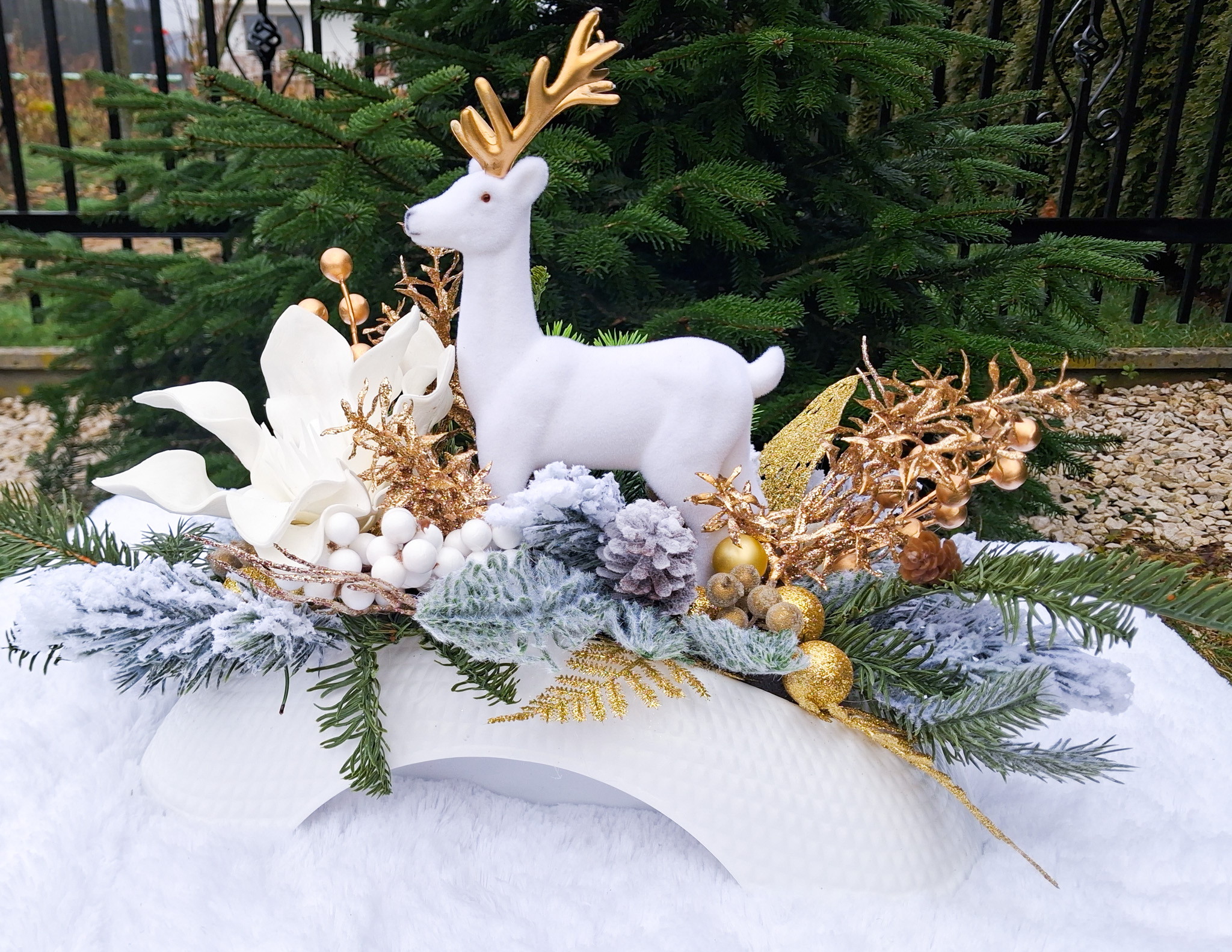 Wprowadź magiczną atmosferę świąt do swojego domu dzięki wyjątkowemu stroikowi bożonarodzeniowemu. Ten elegancki dekor charakteryzuje się złoto-białym wykończeniem, które dodaje całości luksusowego wyglądu i doskonale podkreśla świąteczny nastrój.