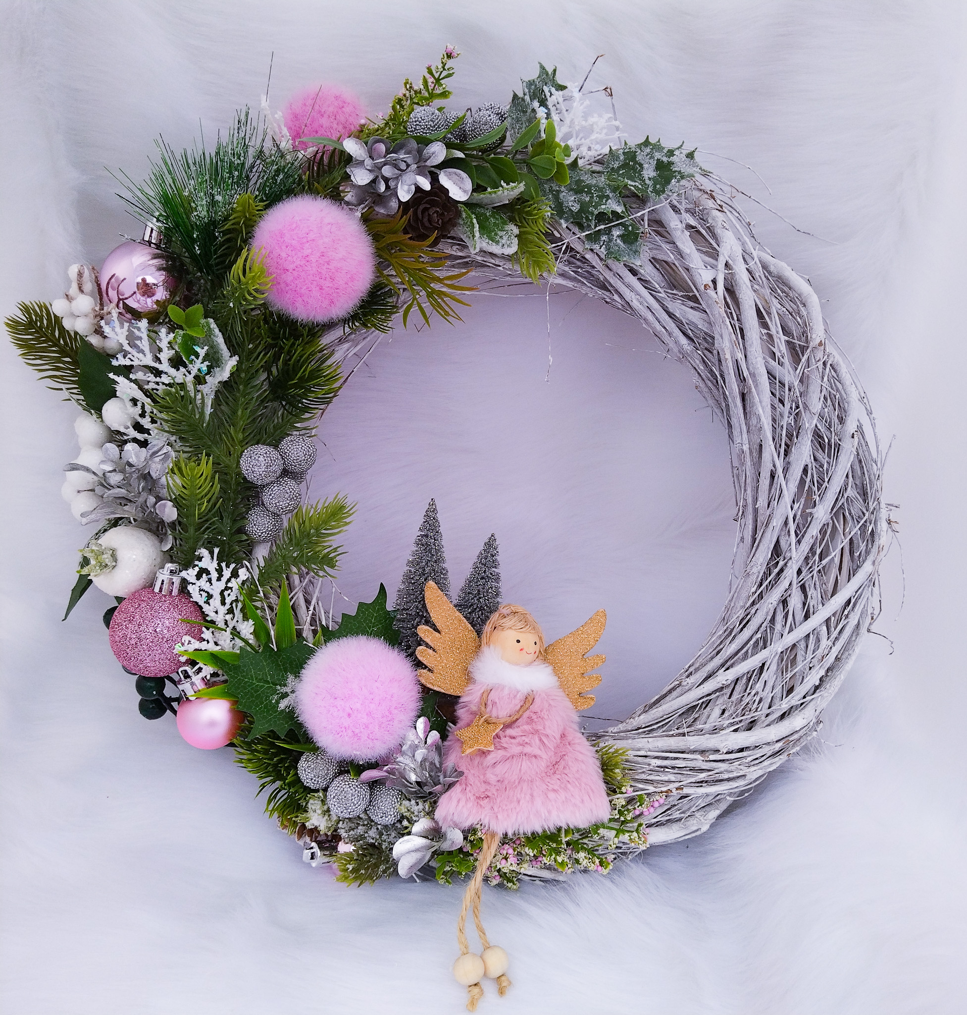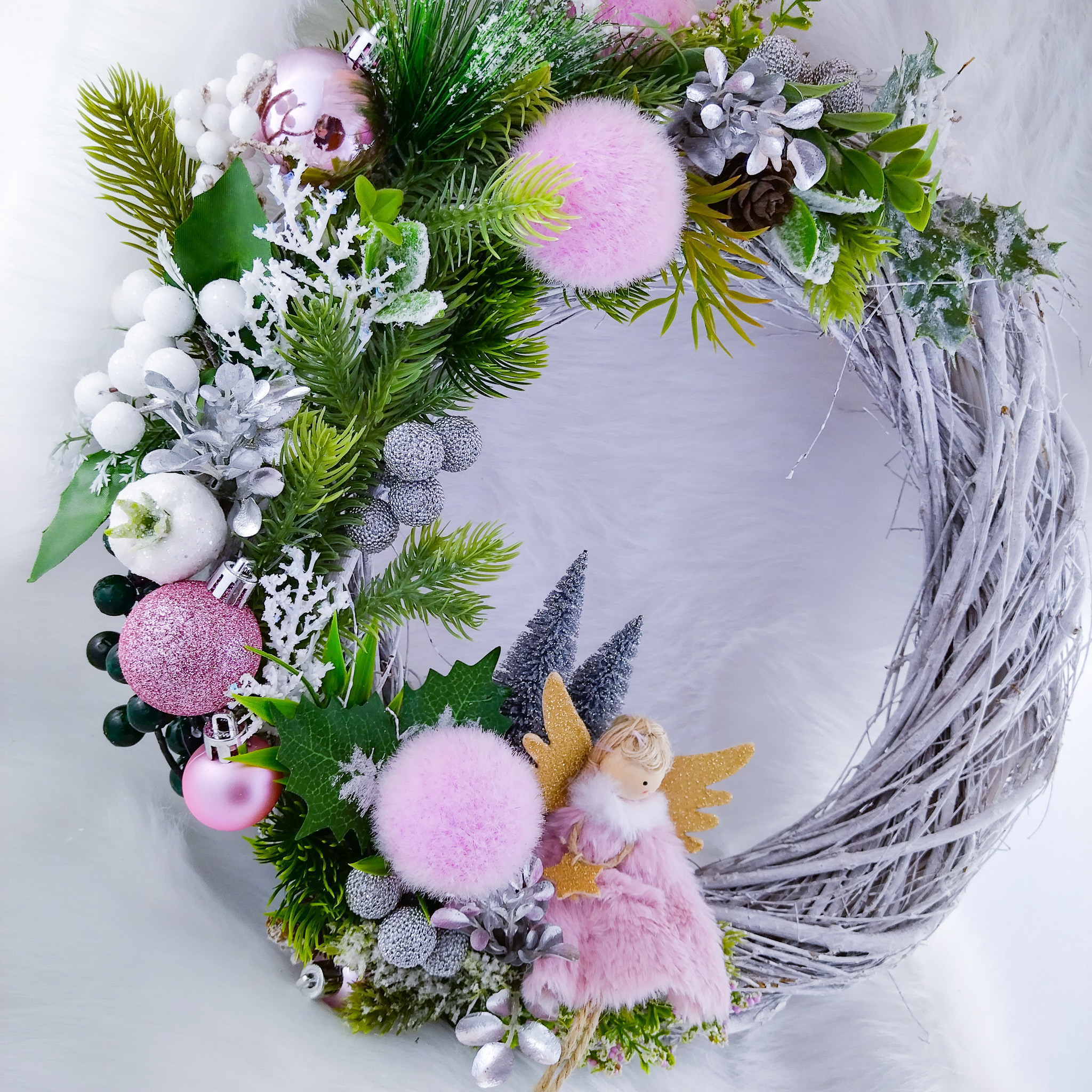 Wieniec bonarodzeniowy na drzwi różowyWieniec bonarodzeniowy na drzwi różowy